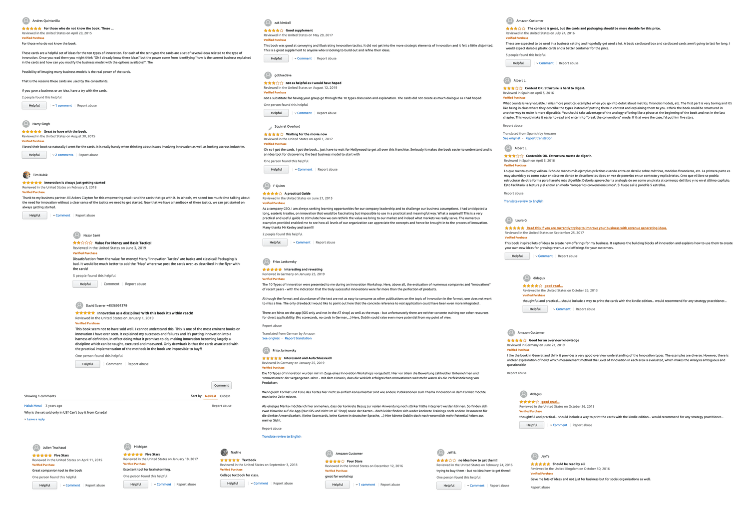 Areas: Amazon Global Customer Reviews for Ten Types Book & Innovation Tactics Cards, Medium Blog Posts, & other news posts